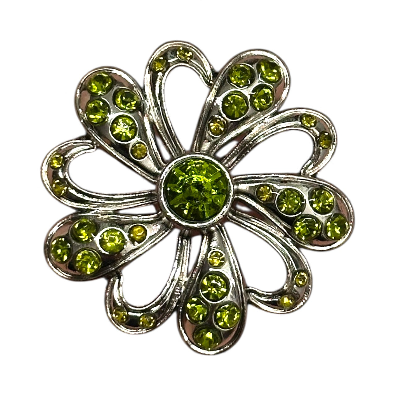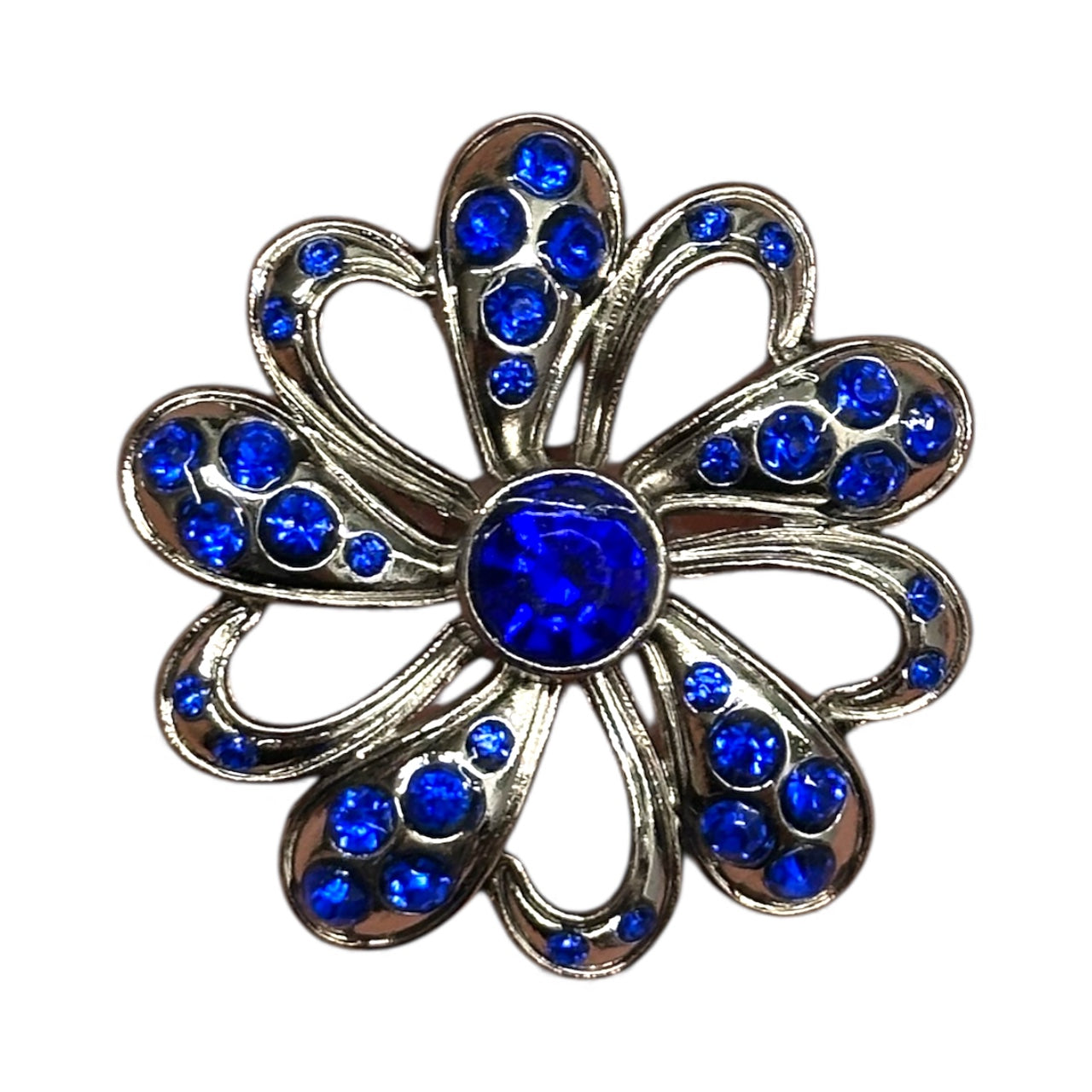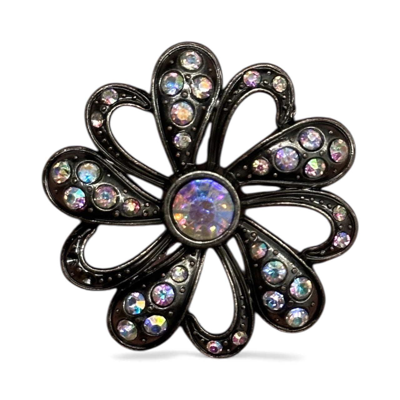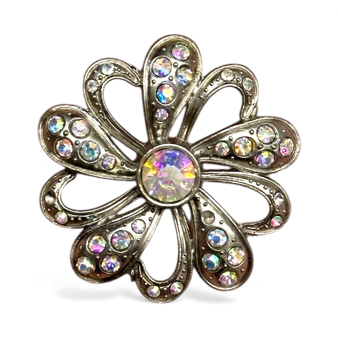 The concho features an intricate open-petal floral design, adorned with sparkling crystals that add a vibrant and elegant touch. The center of the flower holds a larger gemstone, while smaller crystals accentuate the petal edges, creating a dazzling effect. It is available in four stunning crystal colors: