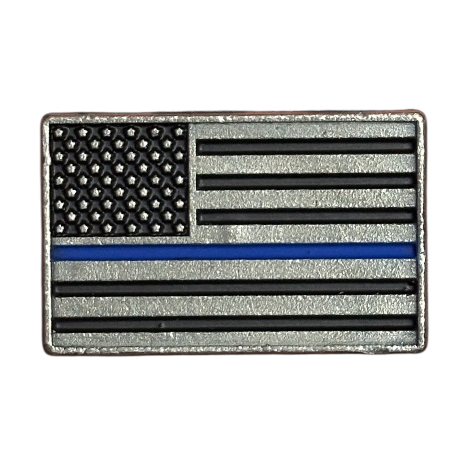 This is a Blue Line Flag concho made of Zinc, measuring 1 1/4" x 3/4". It features a design inspired by the Thin Blue Line Flag, symbolizing support for law enforcement. The flag design is detailed with a single bold blue line running across the middle, contrasting against the rest of the flag’s silver or black elements.