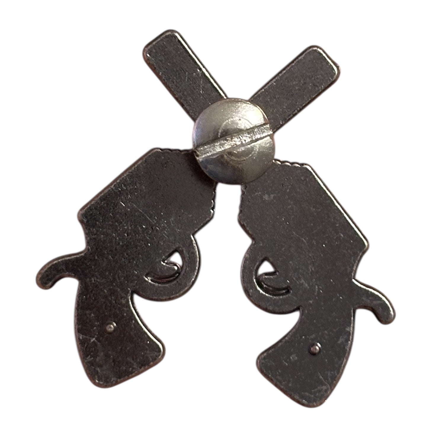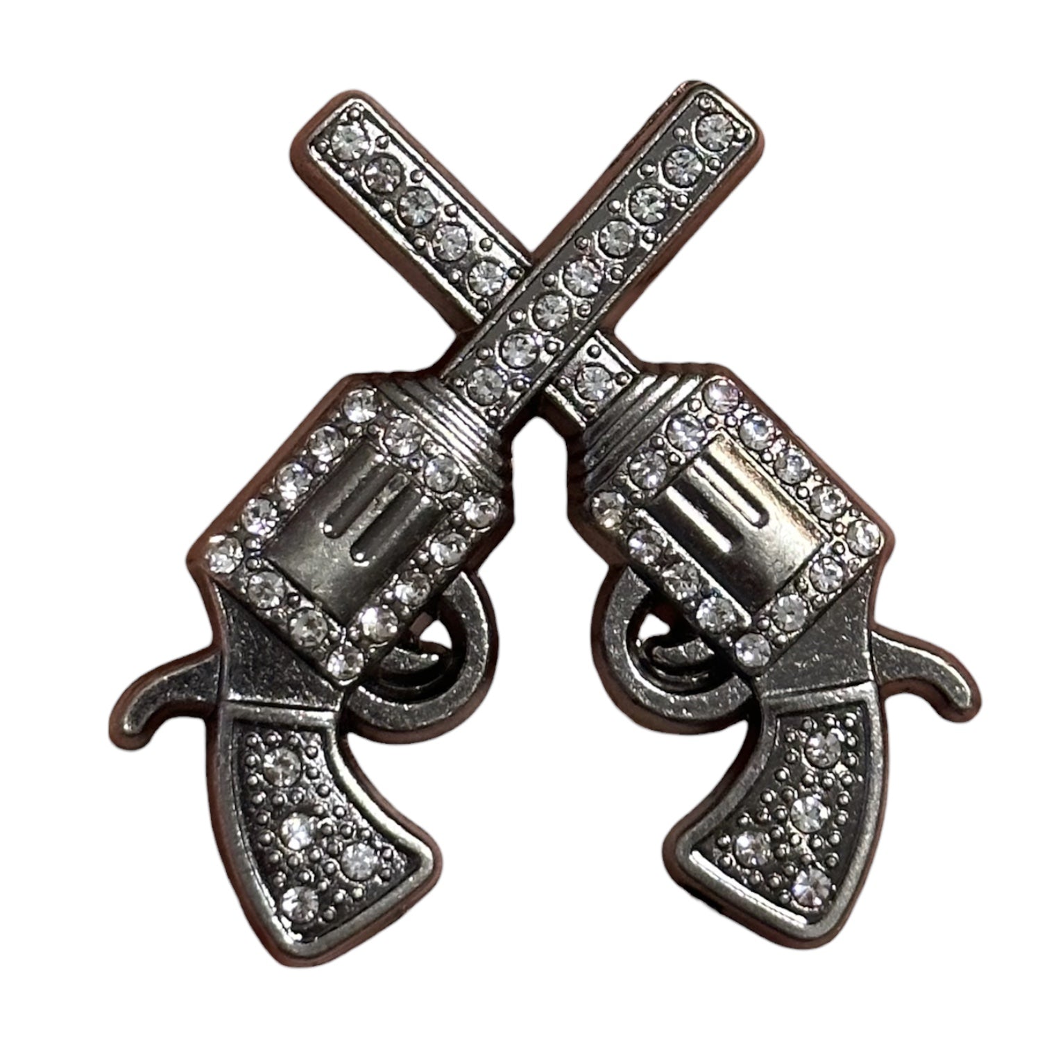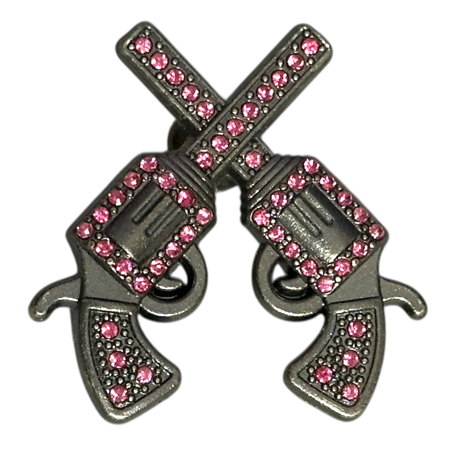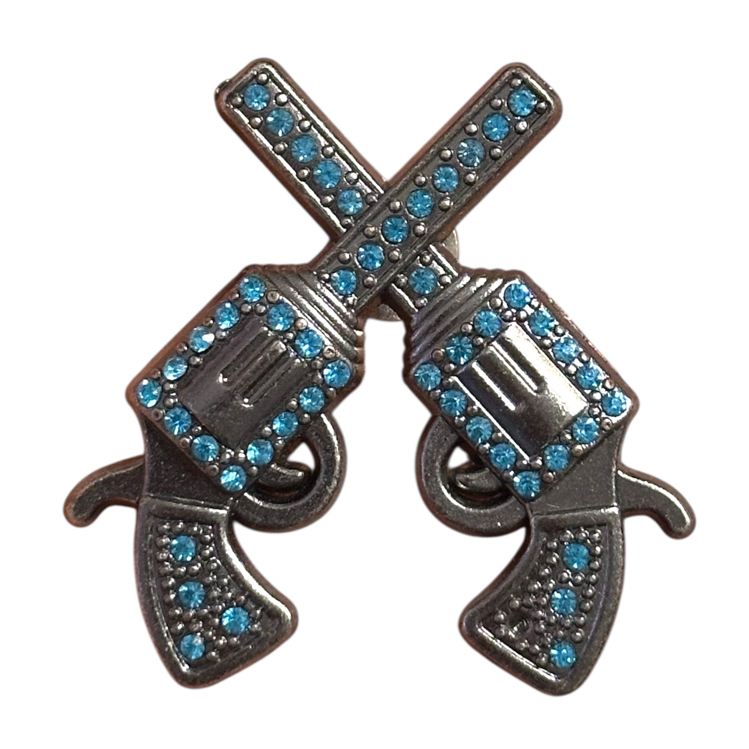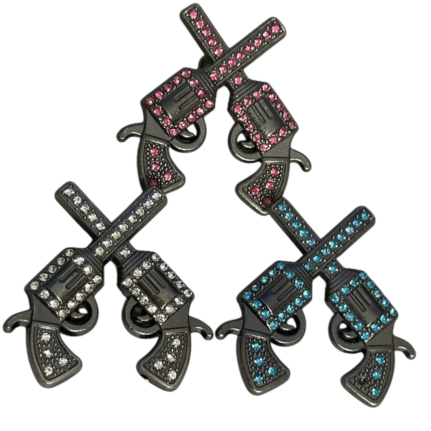 This is a decorative Pistol concho featuring a pair of crossed pistols with a nickel finish. The pistols are adorned with sparkling crystals, which come in blue, pink, and clear (crystal) options, adding a stylish and eye-catching touch. The bright nickel finish enhances the contrast between the metal and the crystals, giving it a bold and polished look.