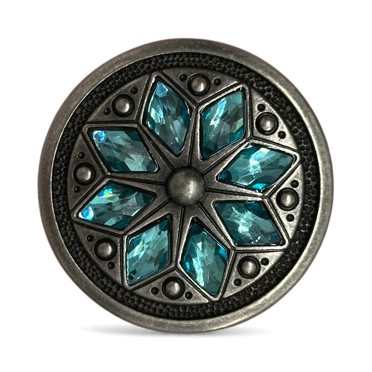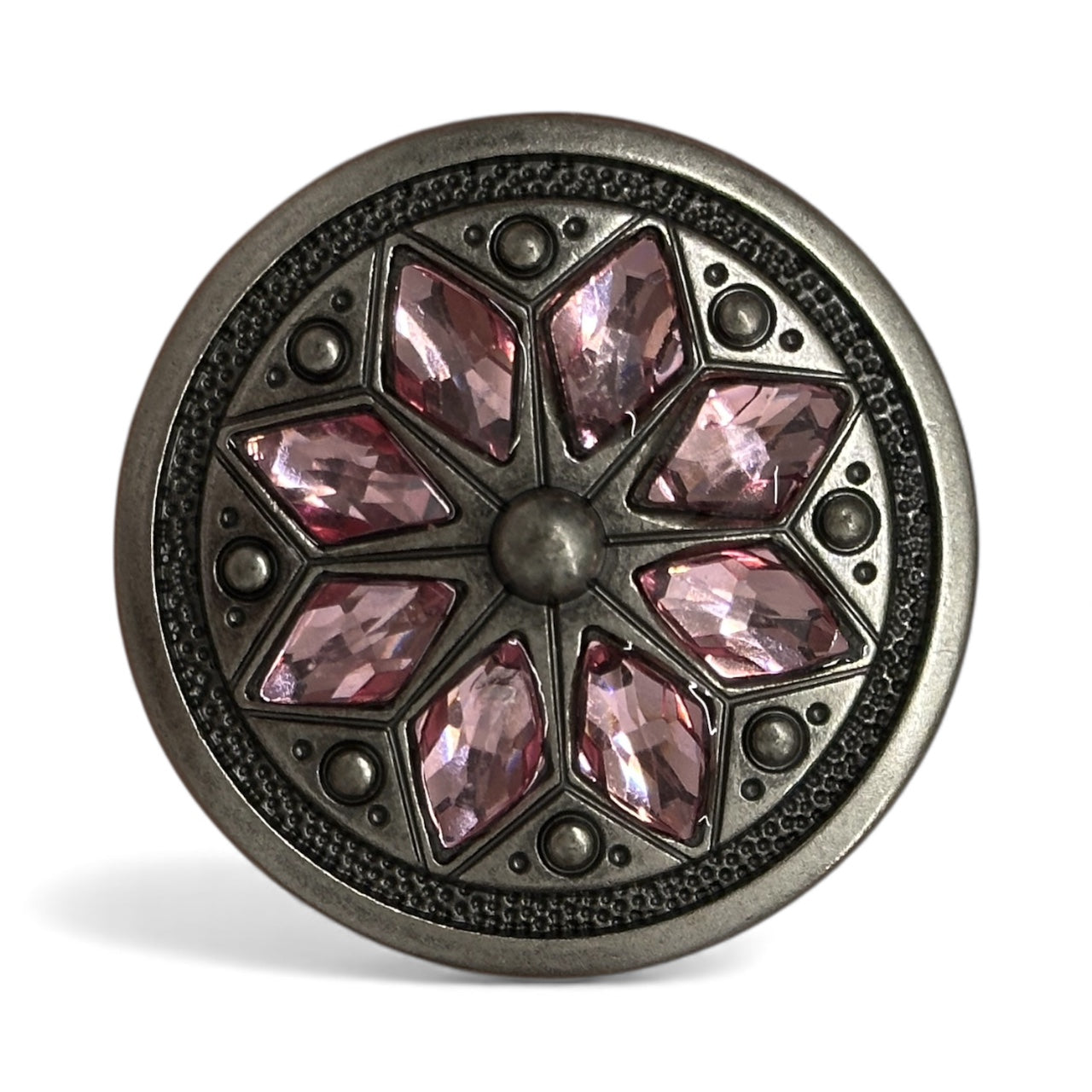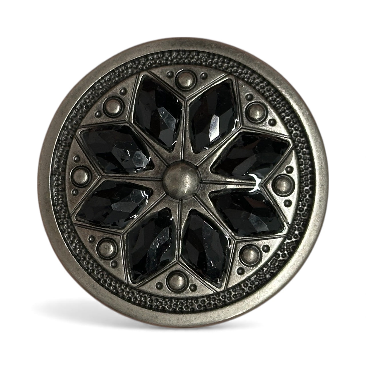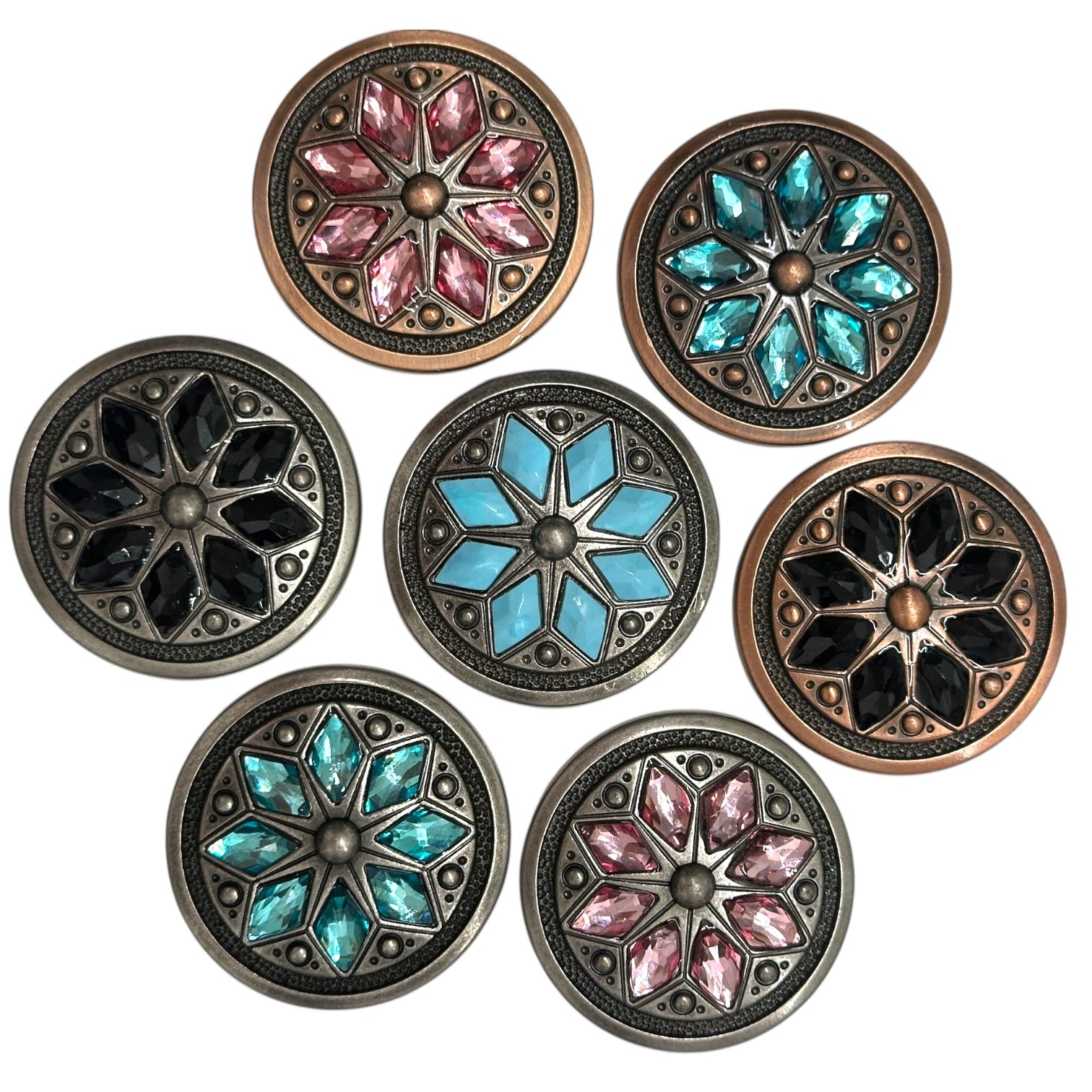 This is a jeweled flower concho with a screw-back attachment, measuring 1 1/2" in diameter. It features an intricate floral-inspired design, with a raised central dome surrounded by eight faceted gemstone accents, creating a stunning and elegant look.