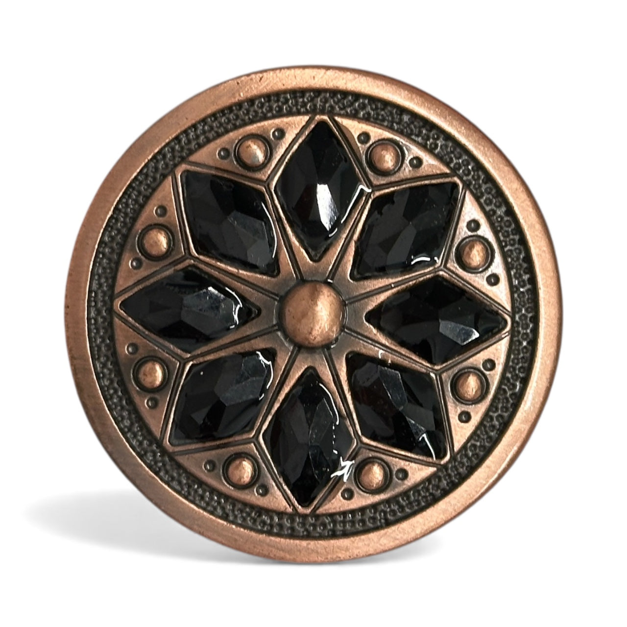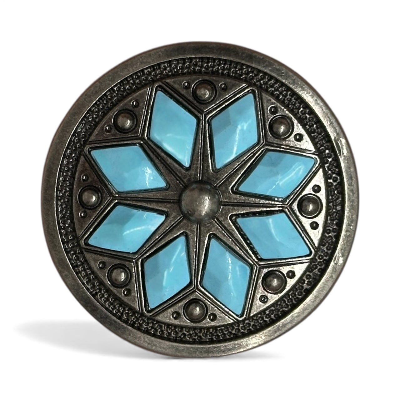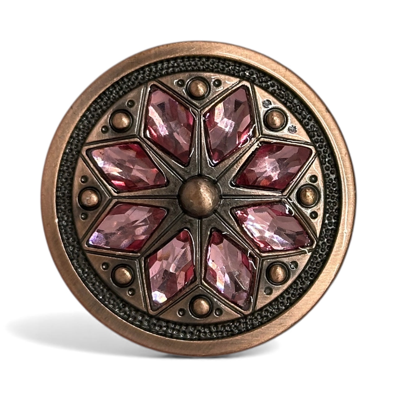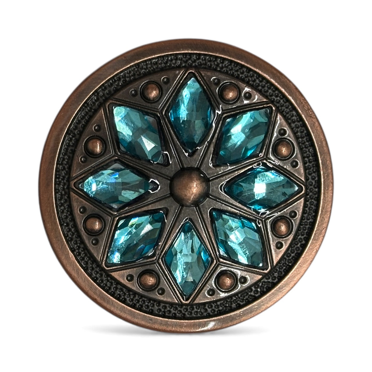 This is a jeweled flower concho with a screw-back attachment, measuring 1 1/2" in diameter. It features an intricate floral-inspired design, with a raised central dome surrounded by eight faceted gemstone accents, creating a stunning and elegant look.