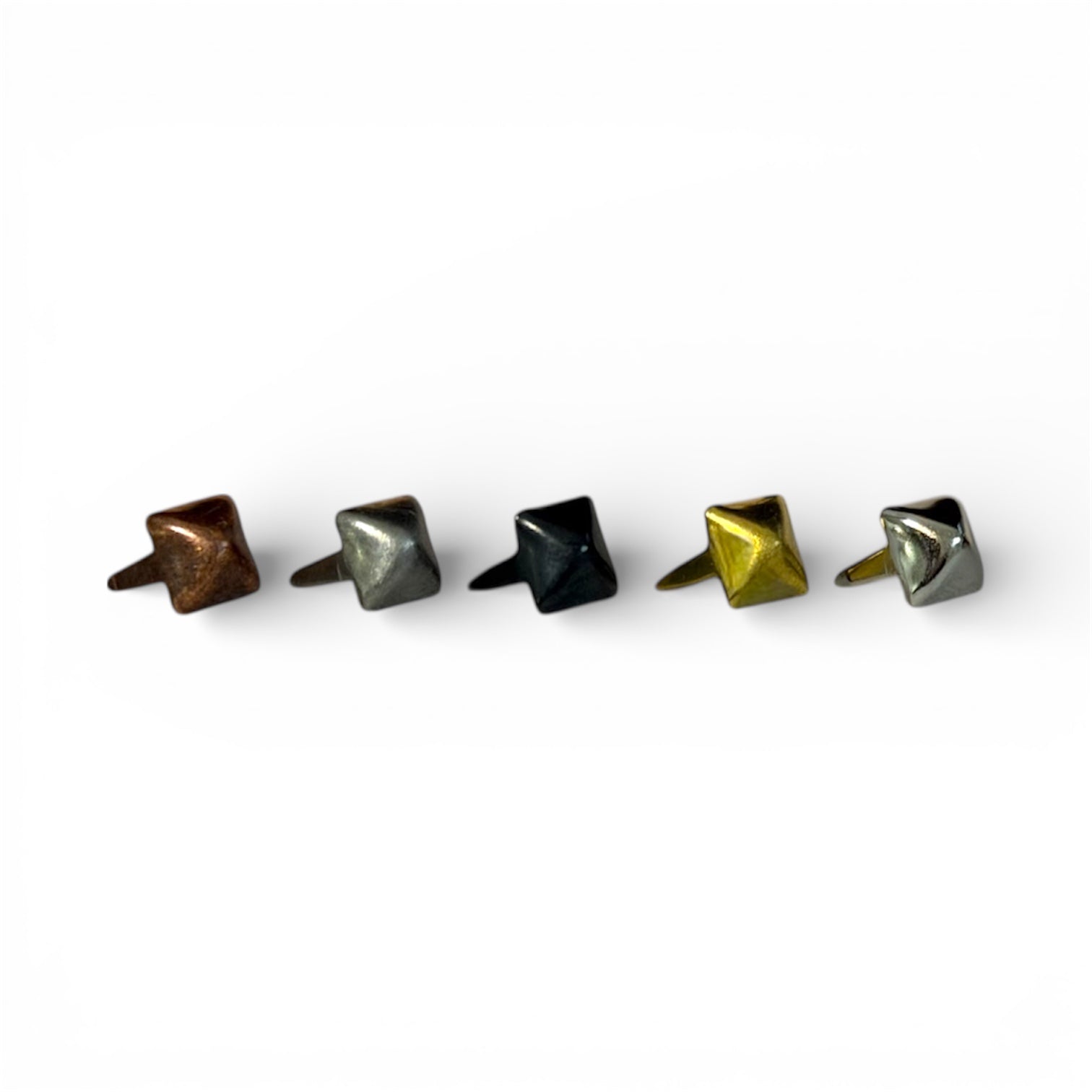 3/16” Pyramid Spots with two prongs, made of brass available in multiple finishes. A small, structured accent for collars, belts, guitar straps and leathercraft. This item is part of our full collections of Leather Spots and Nailheads.