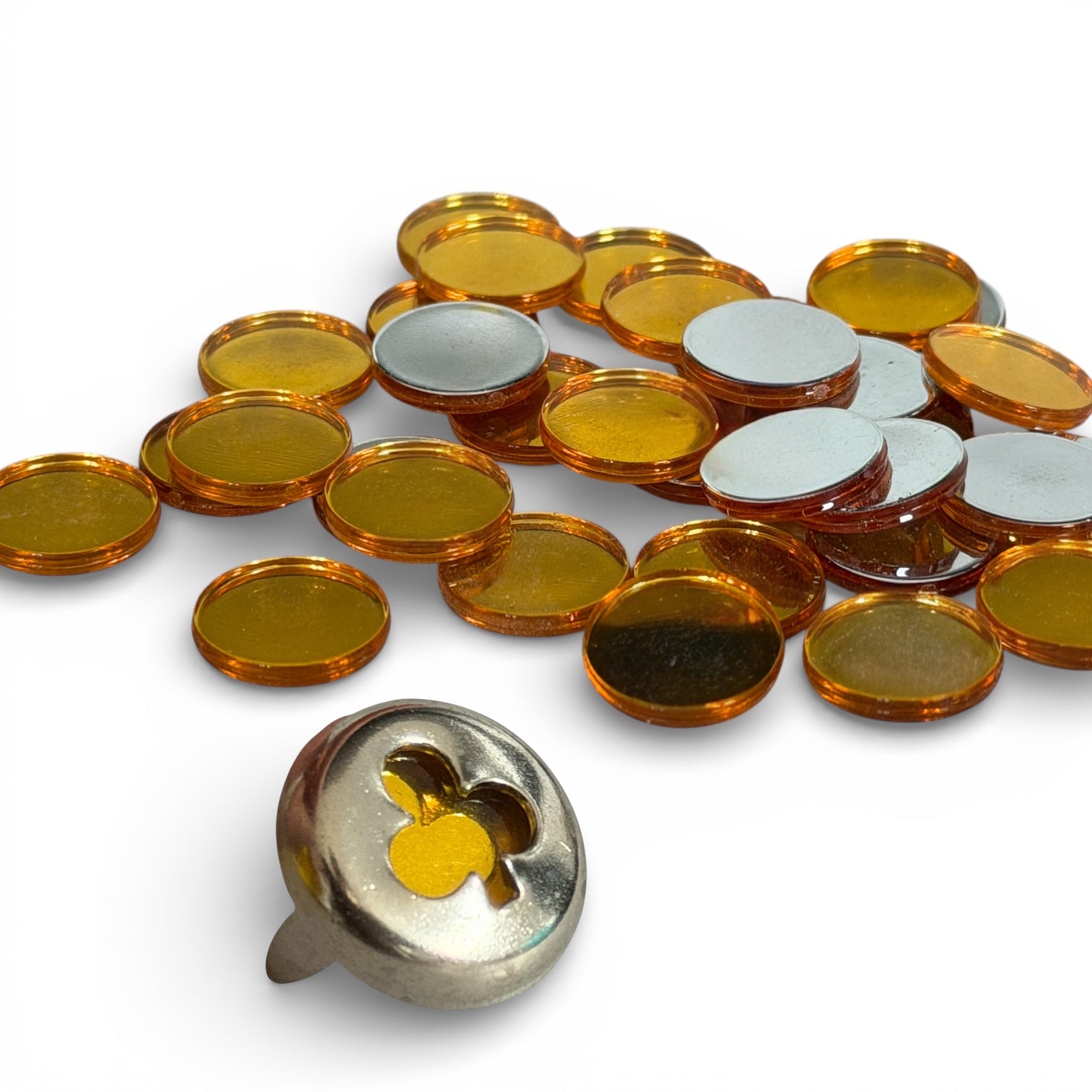 Add a touch of sparkle with our Amber Flat Colored Discs. Sized at 5/8", perfect for enhancing bags, belts, wallets, and more. These Discs fit in our 5/8” Cut-Out Spots . Simple to use and full of flair, these discs are the perfect way to add a little extra glam to your leather accessories.
