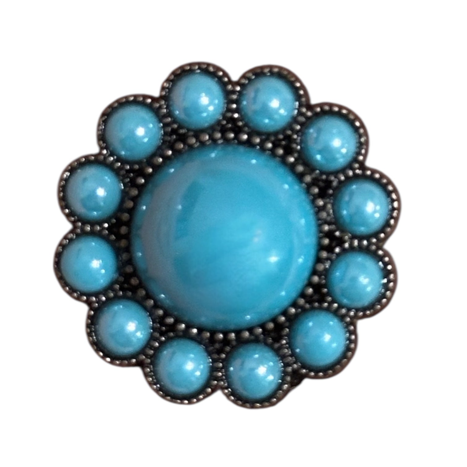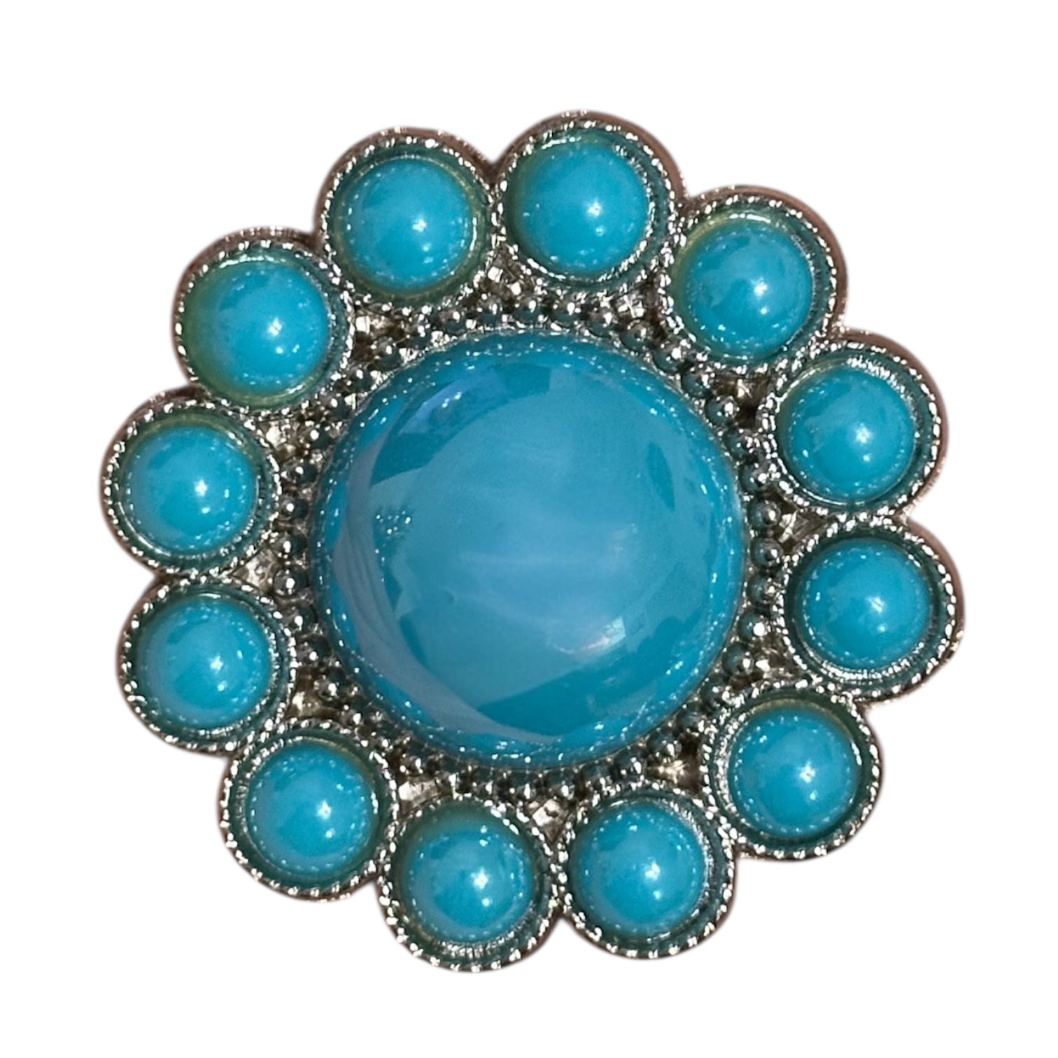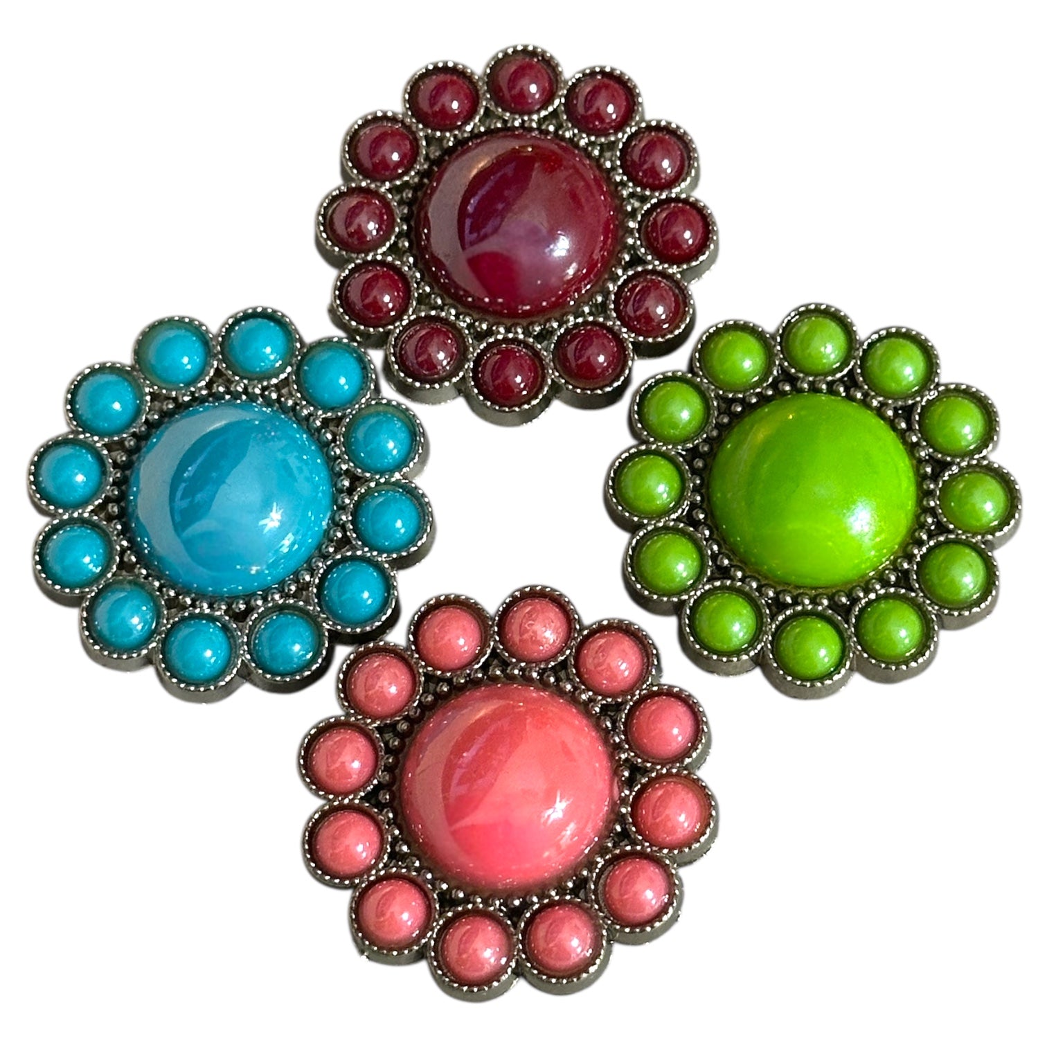 This beautifully “beaded” screw back concho comes in 4 different colors. Small cabochons surround a large center cabochon. This concho will enhance any product. Pair with the NEW marble jewel line. Available in 1" and 1 1/2".