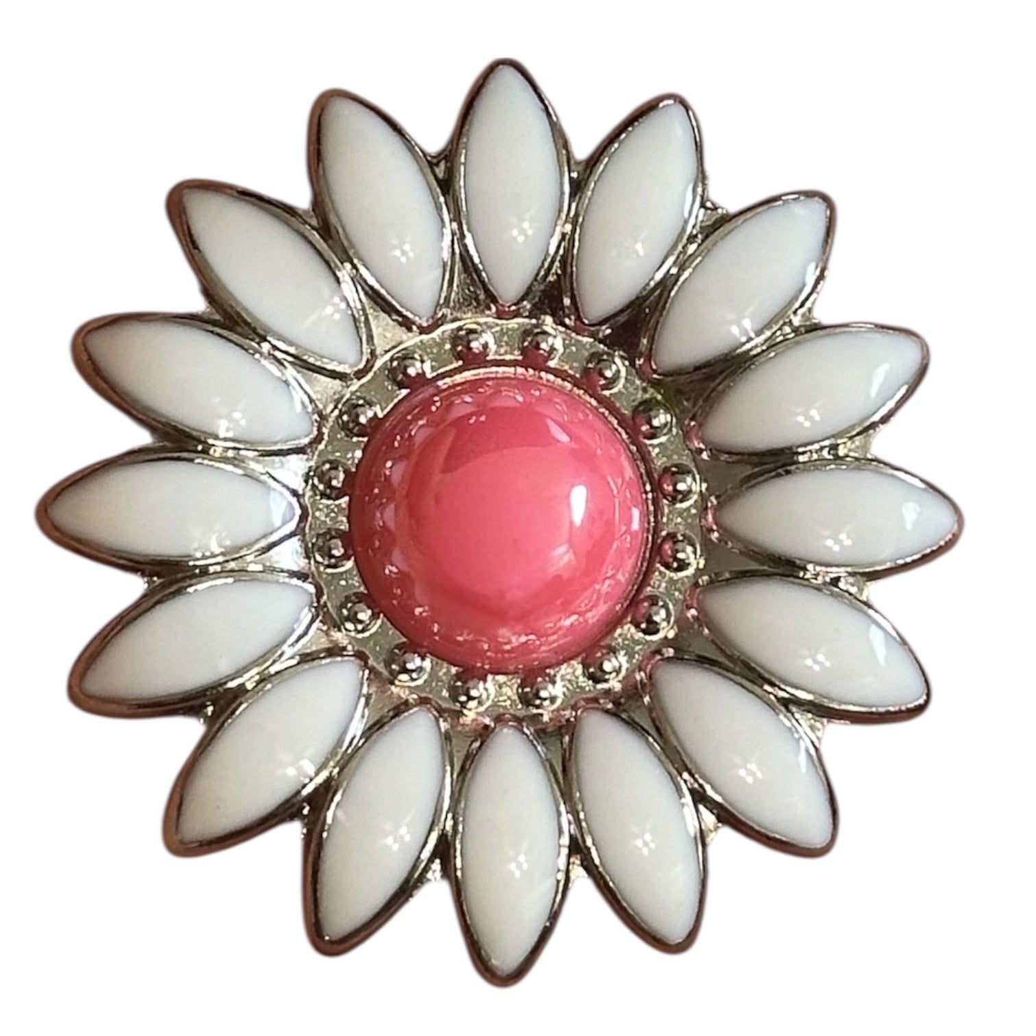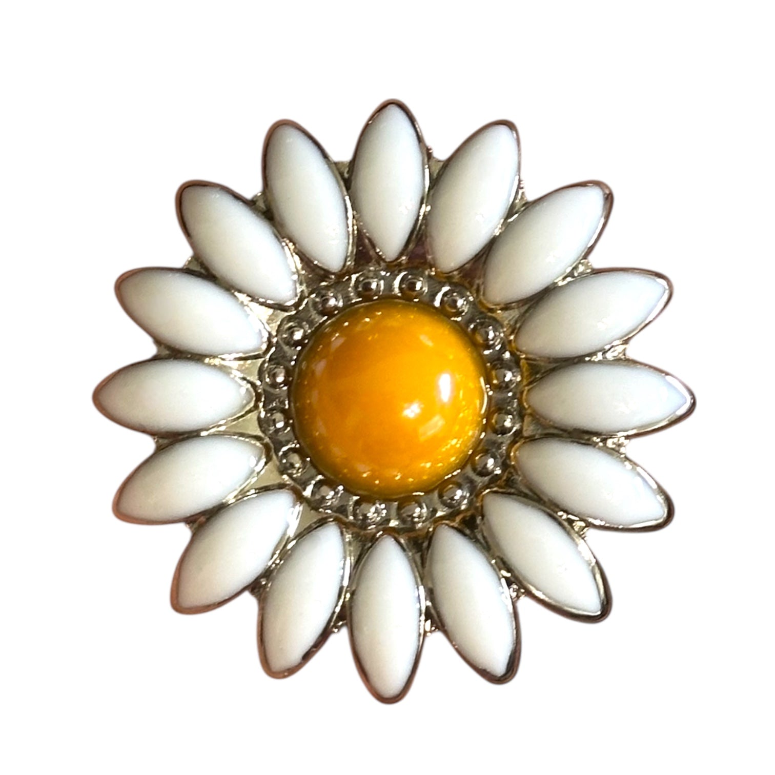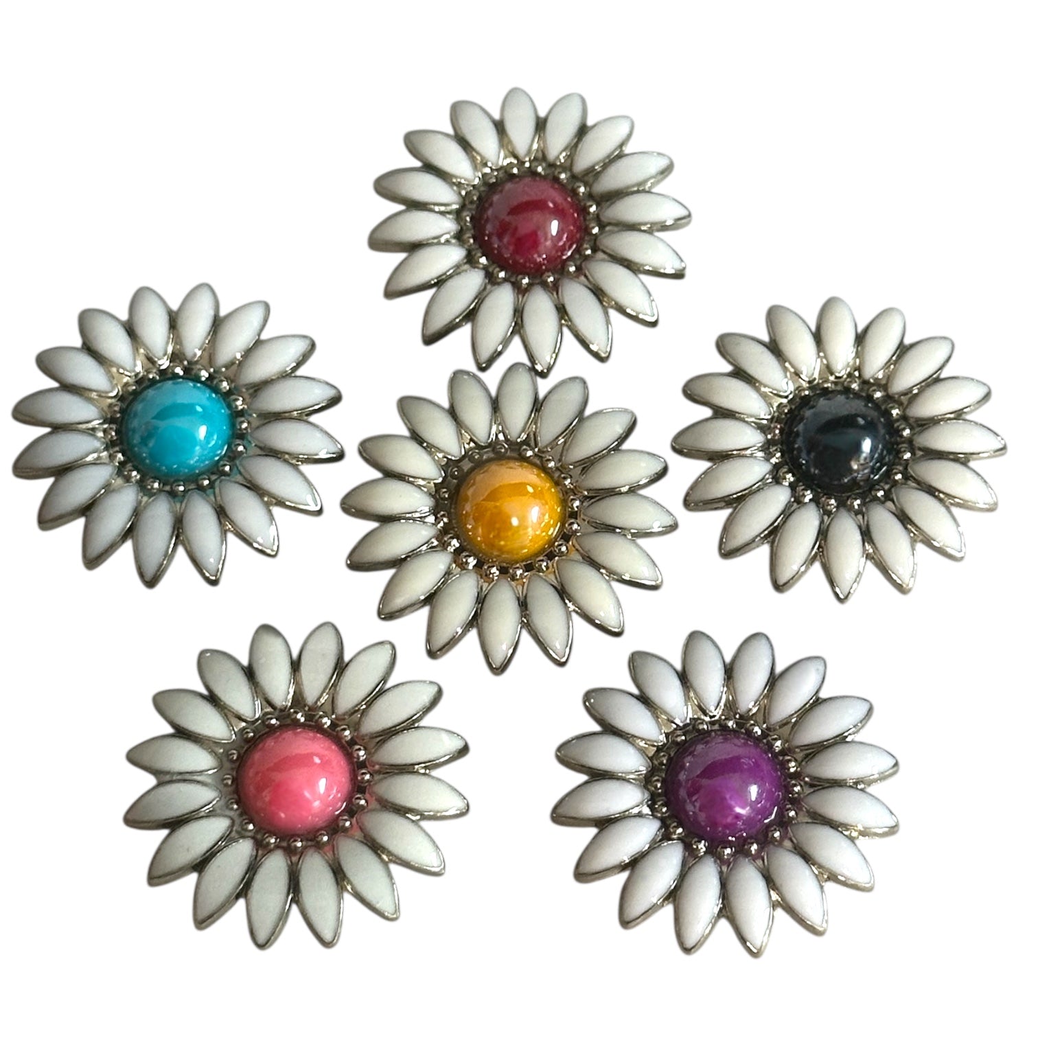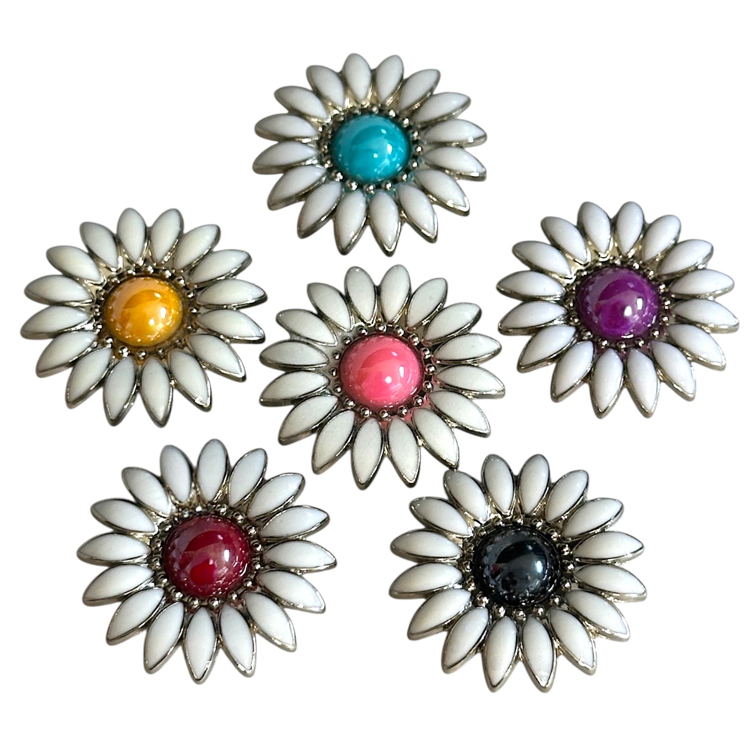 This is a daisy-shaped concho with a screw-back attachment, available in three sizes: 3/4", 1", and 1 1/4". It features a classic flower design, with delicately crafted petals radiating from a vibrant center, creating a timeless floral look.