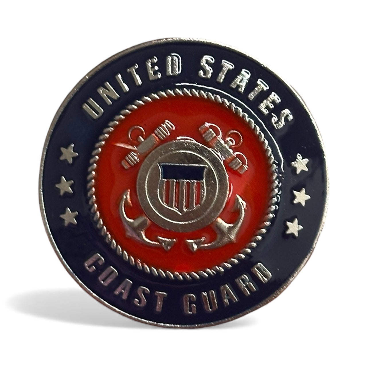 The concho is crafted from durable metal with a polished finish. The design incorporates a red background in the center, surrounded by a blue outer ring with the words "United States Coast Guard" in bold lettering. Small stars accent the outer border, adding to the patriotic theme.