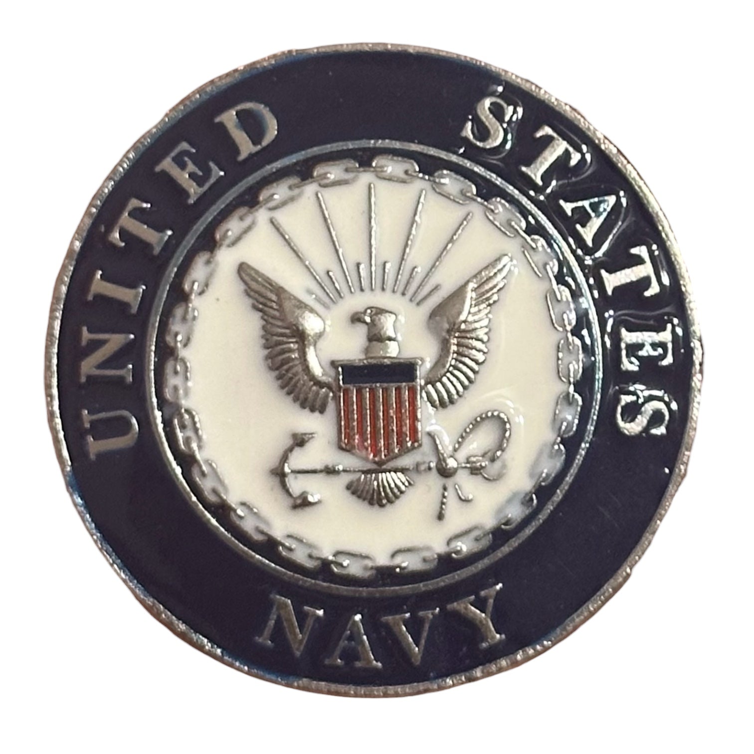 The concho is crafted from durable metal with a polished finish. The design incorporates a white background in the center, surrounded by a blue outer ring with the words "United States Navy" in bold lettering. Small chain accent the outer border, adding to the patriotic theme.