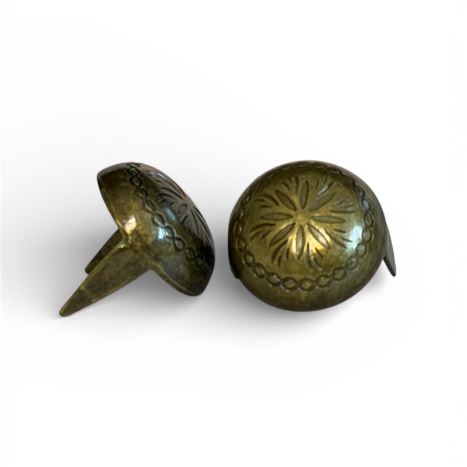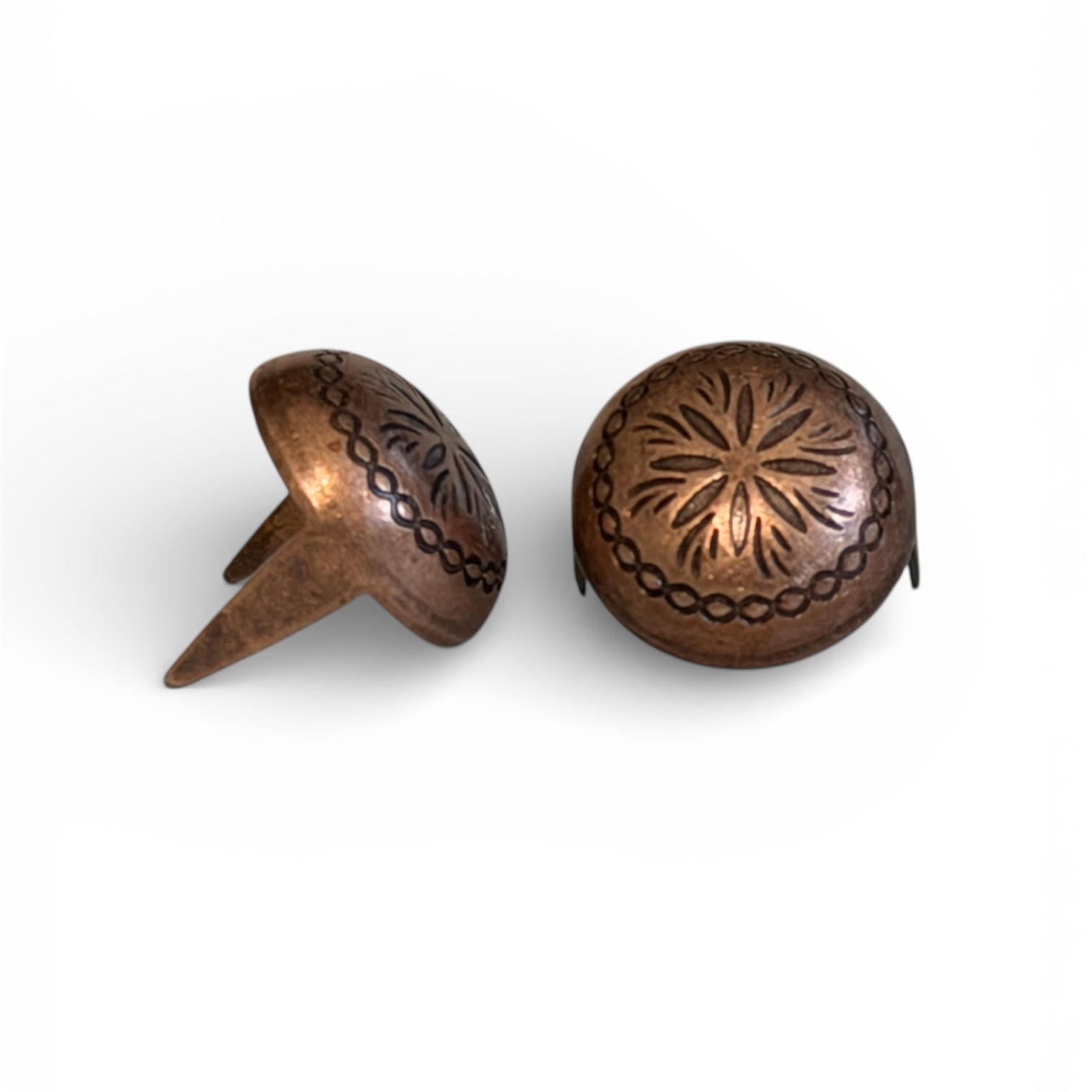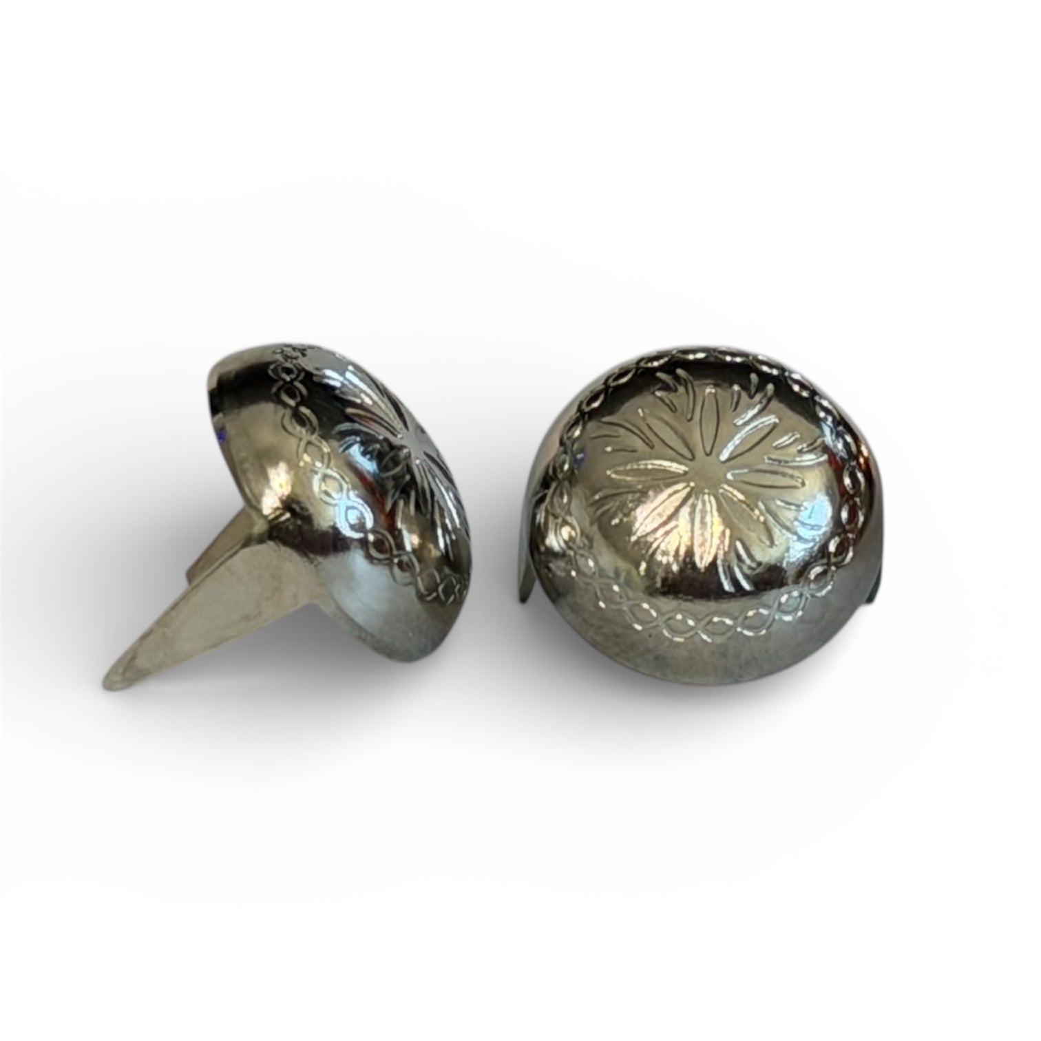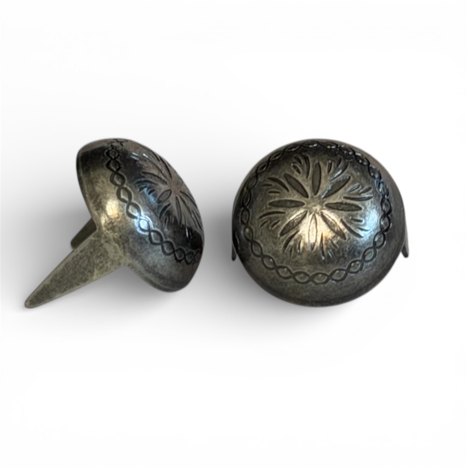 1/2" Sunburst Spot Prongs 5/16" Imprinted spot for leather. Finishes available: Solid Brass, Black, Nickle Plate, Antique Brass, Antique Silver, Copper, Antique Copper.