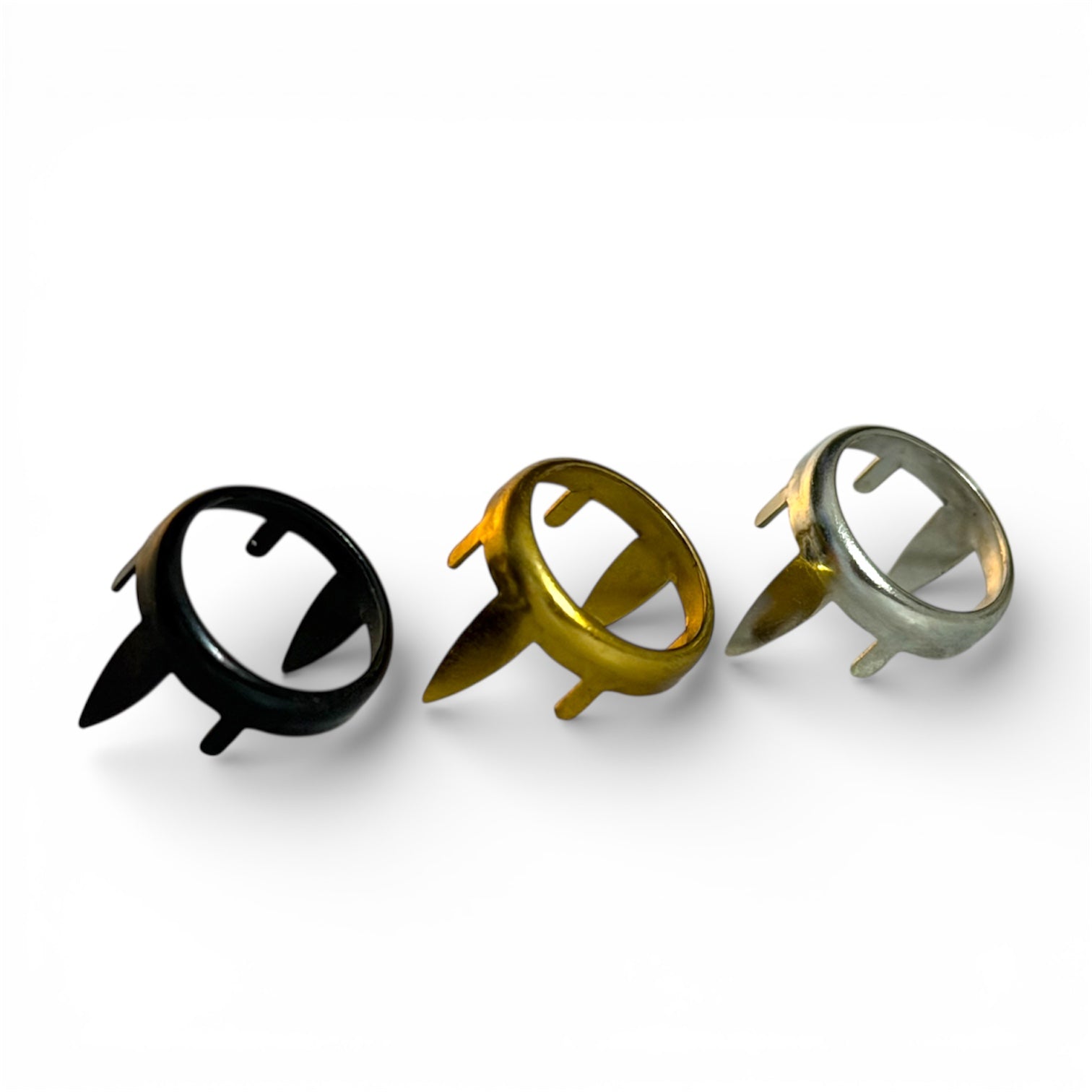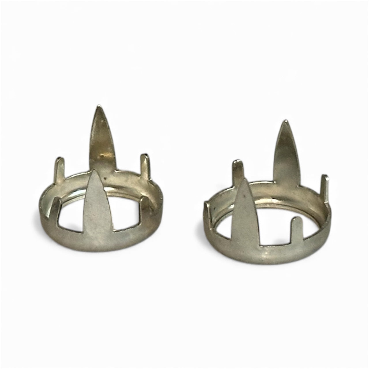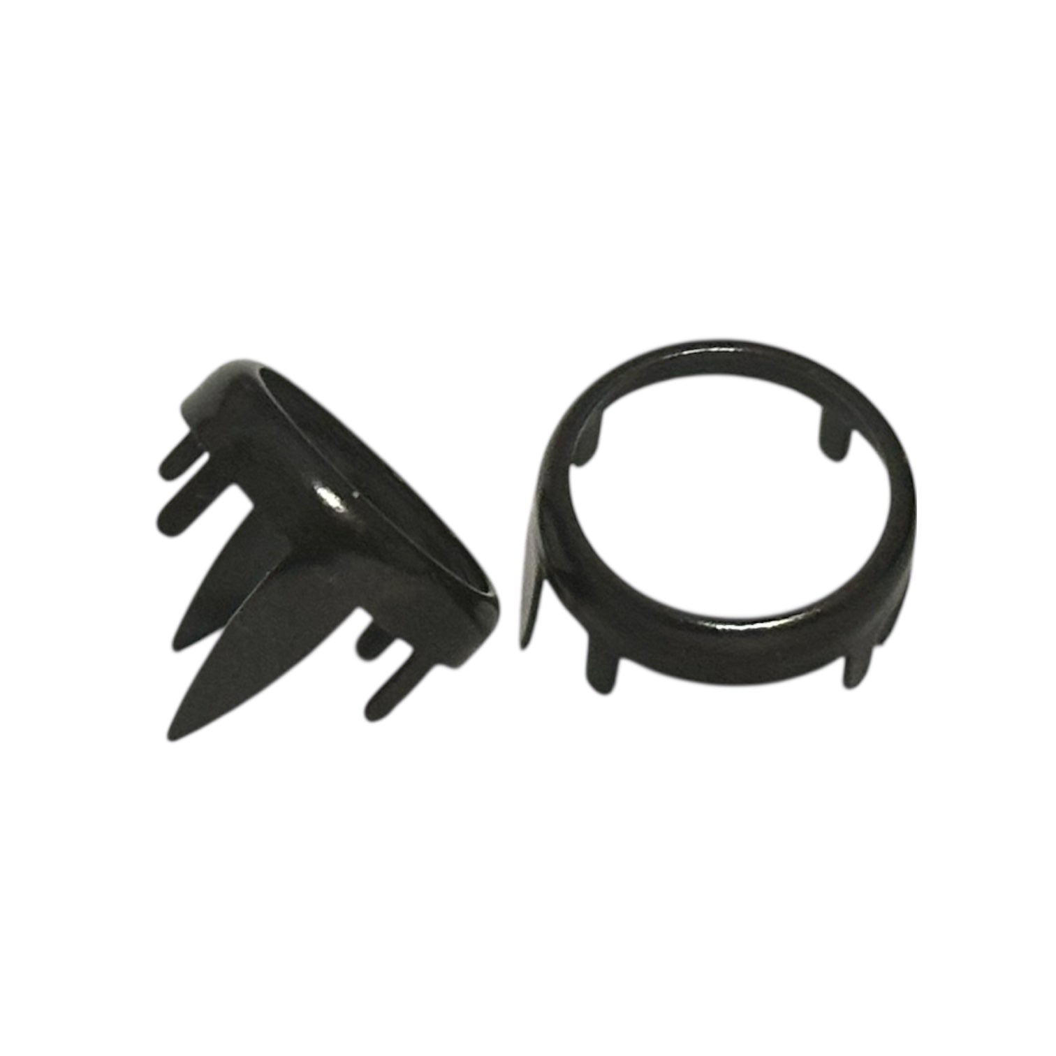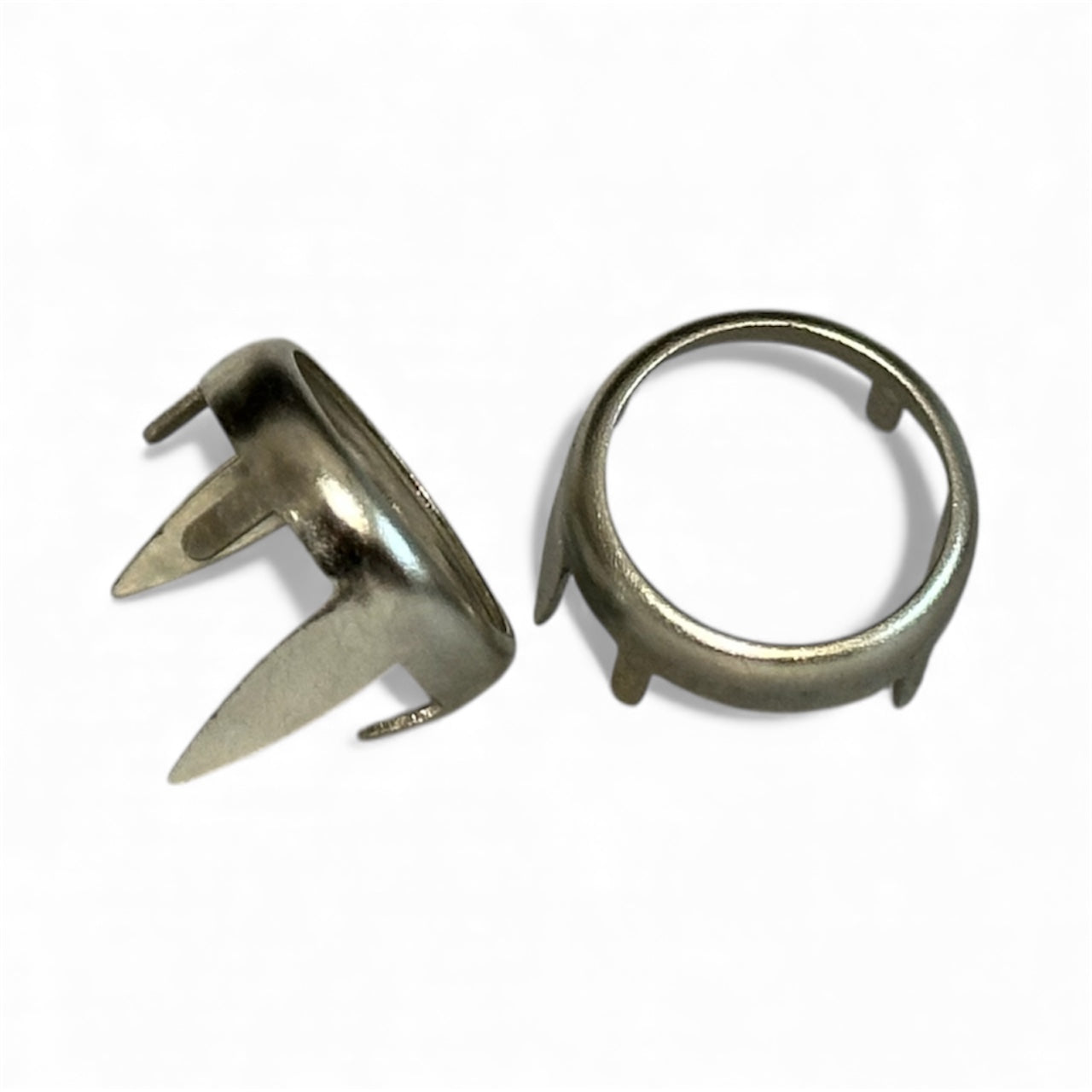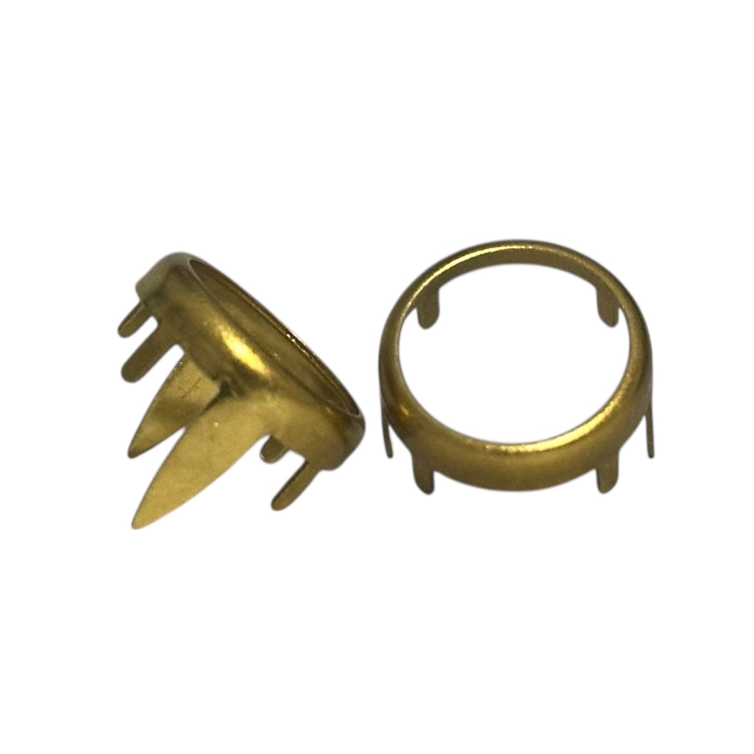 12mm Ring Spot Rim Setting with two 5/16" long legs for securing to leather and four claws to hold a flat-back cabochon or Rivoli in place. Commonly used in bags, dog collars, and belts. Multiple finishes available.