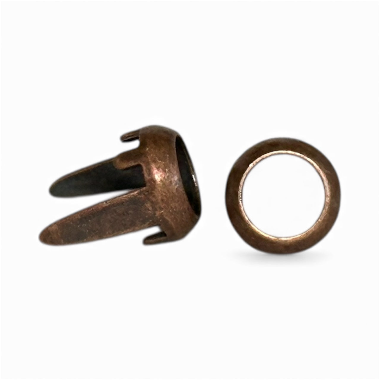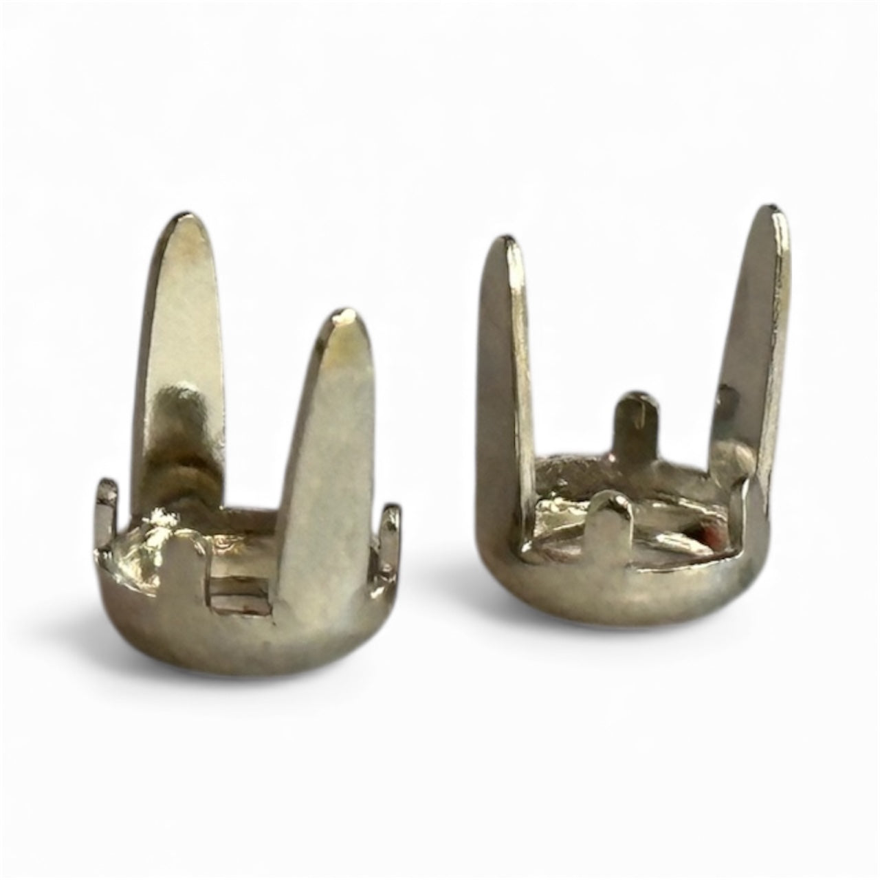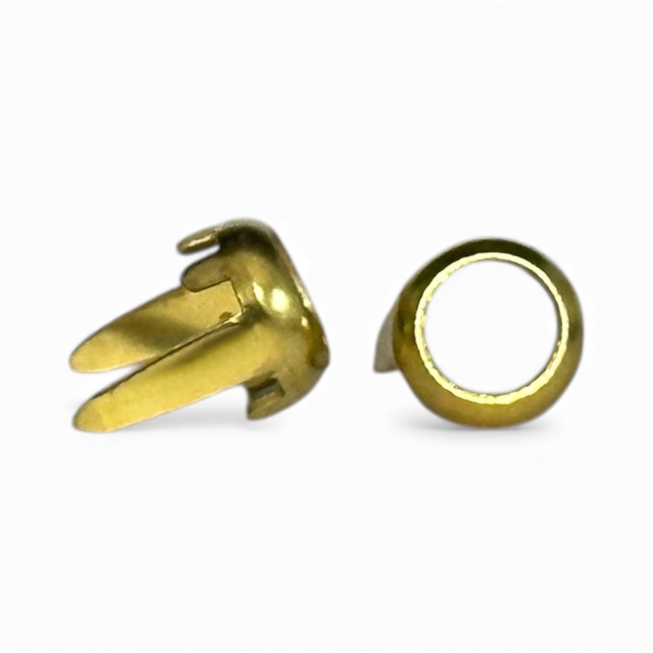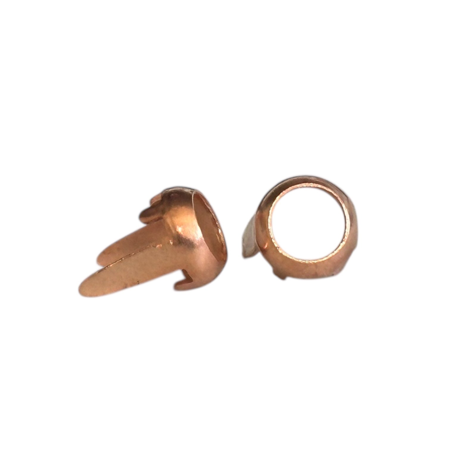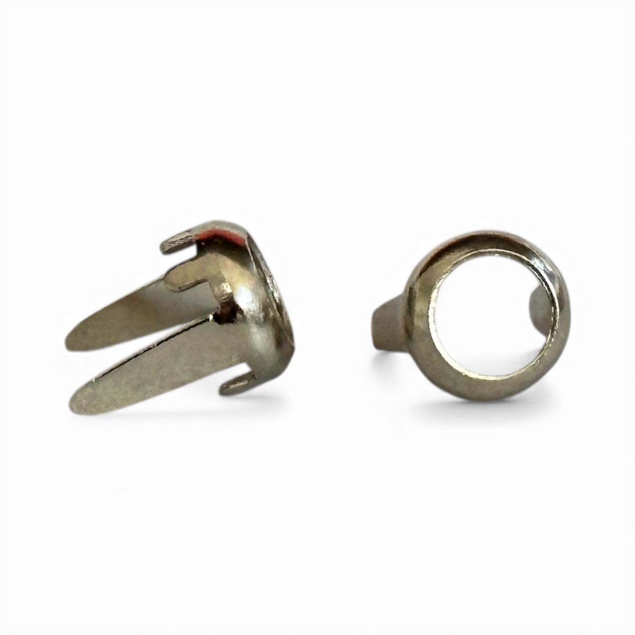 5mm Ring Spot with two, long legs. Rim setting for leather and four folding claws that hold flat-back crystals, cabochons, or pearls. Ideal for collars, belts, and decorative layouts. Available in multiple finishes.