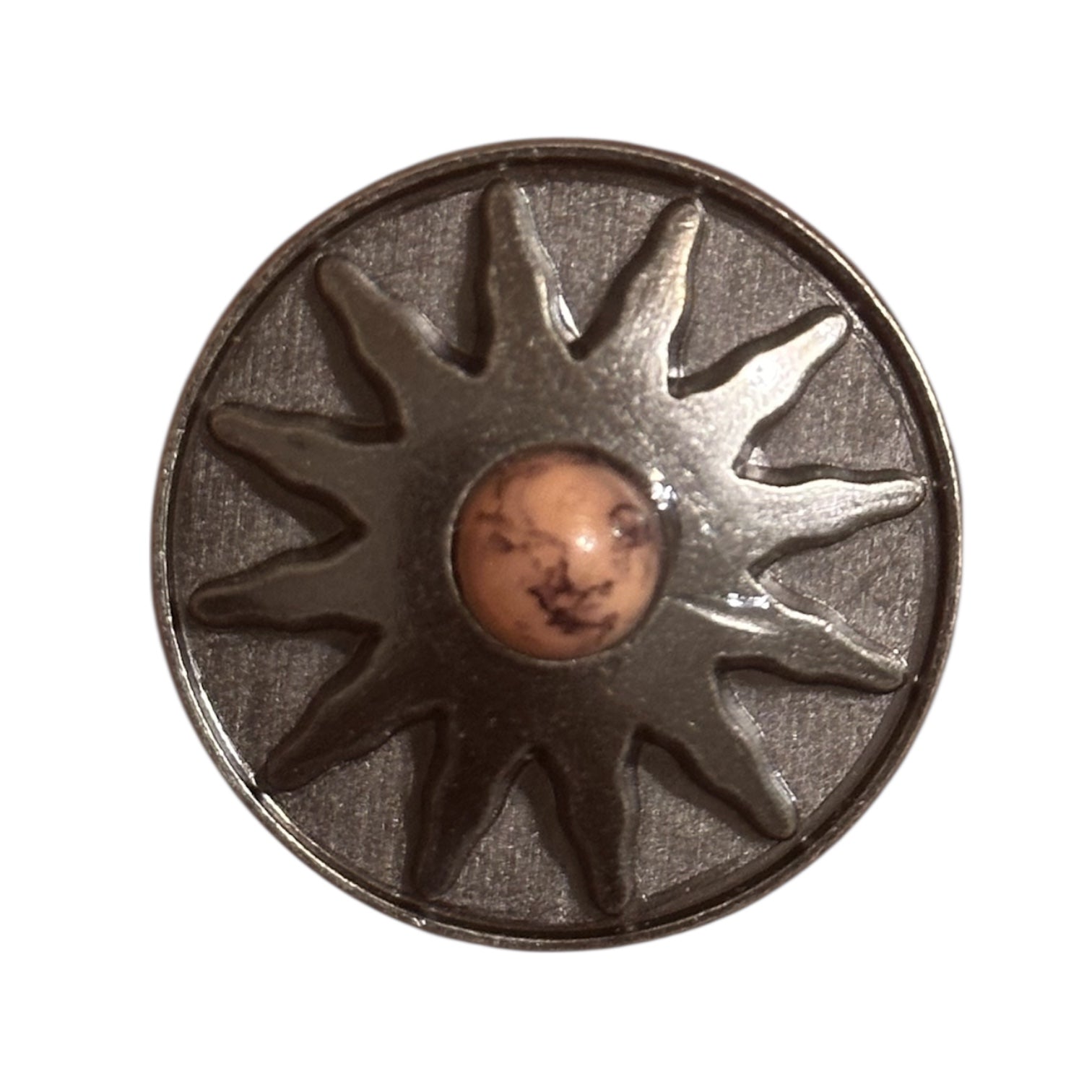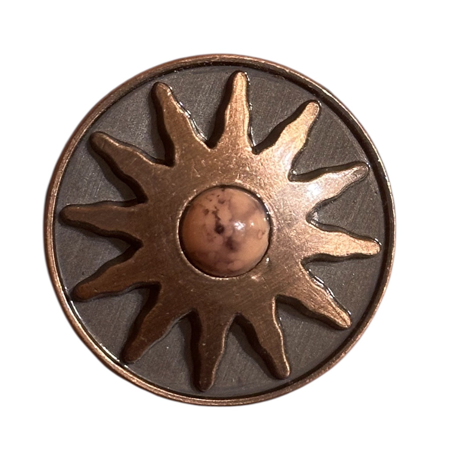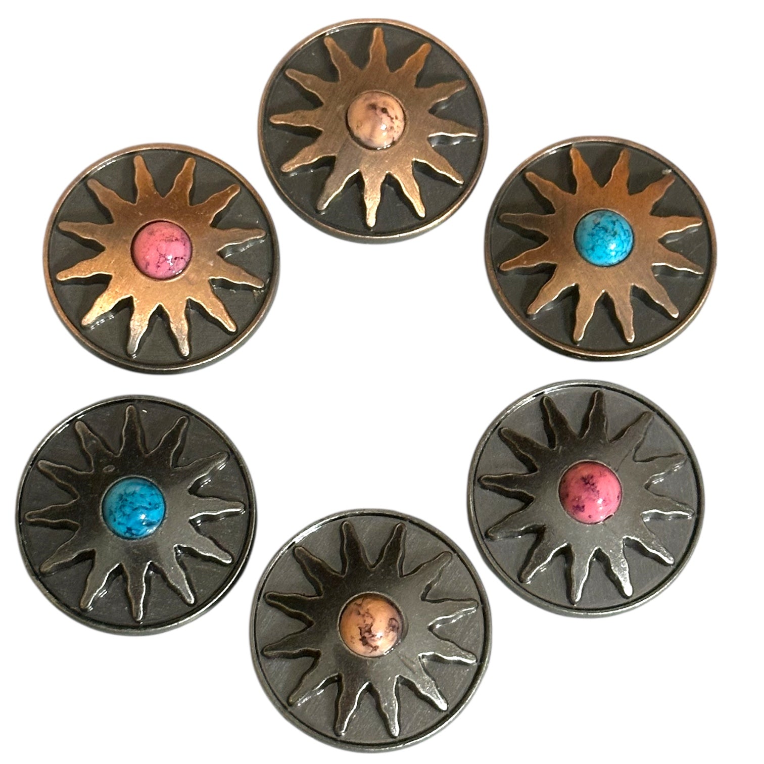 1 1/4" Sun Pattern concho has a beautiful marbled center stone. Available in both antique nickel and antique copper finishes and 3 stone color choices.