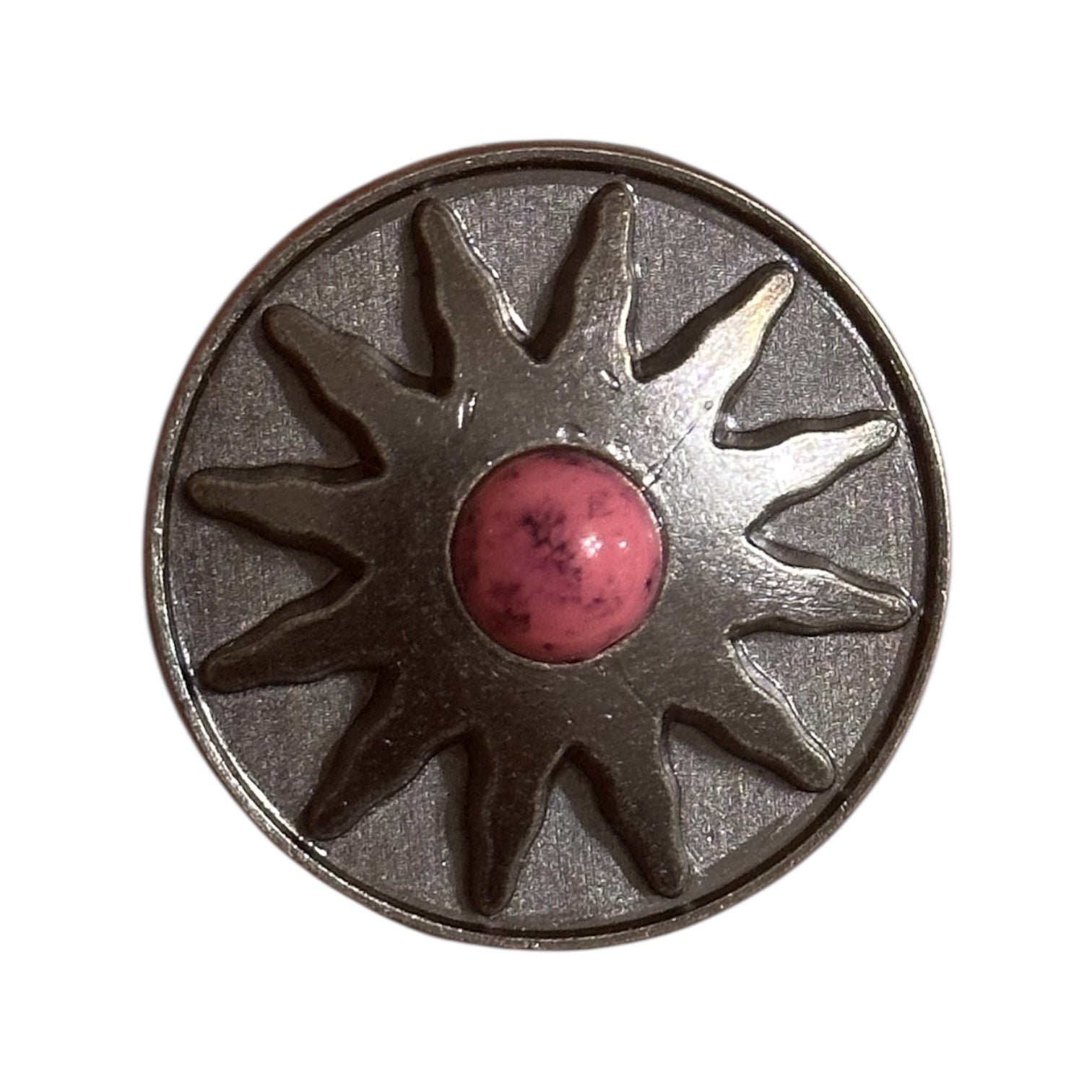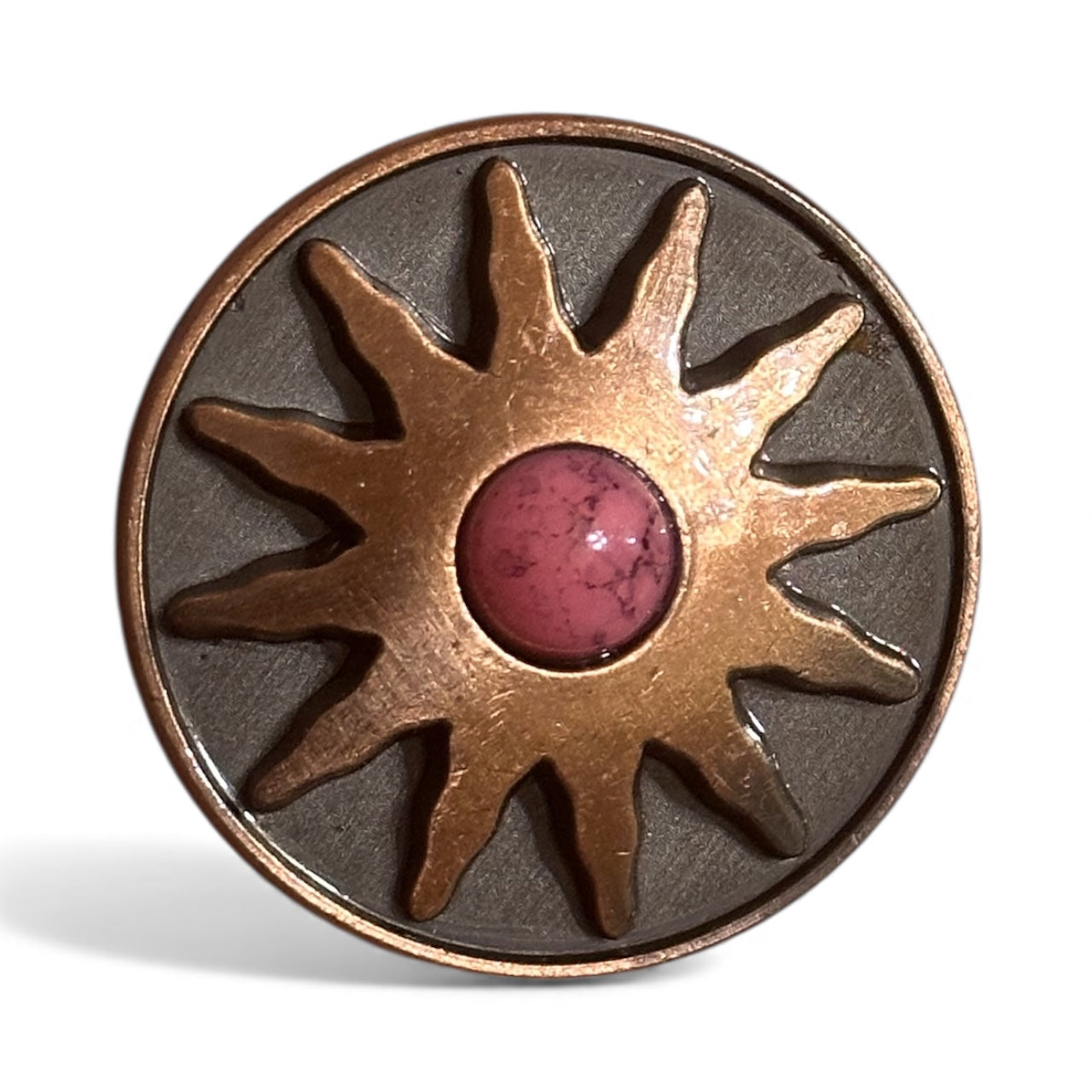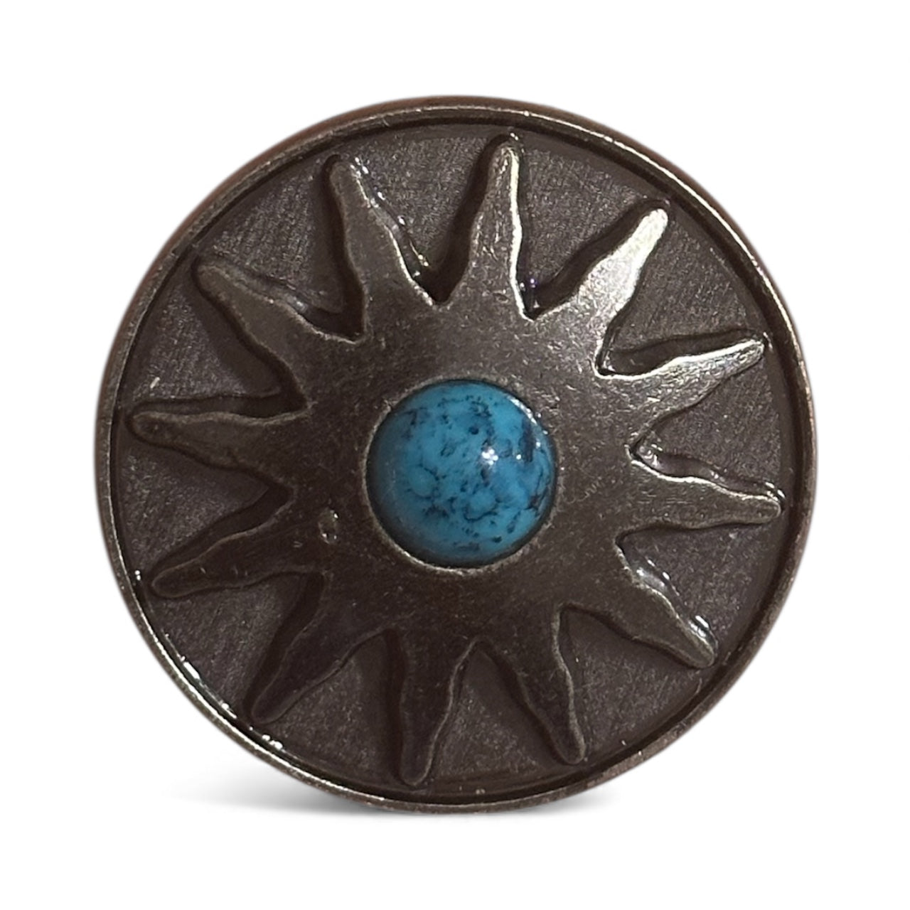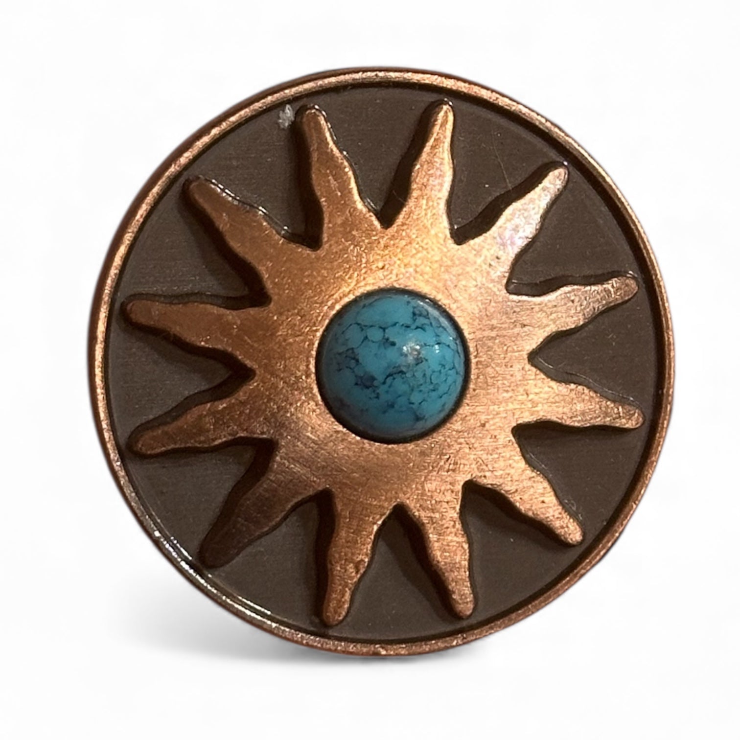 1 1/4" Sun Pattern concho has a beautiful marbled center stone. Available in both antique nickel and antique copper finishes and 3 stone color choices.