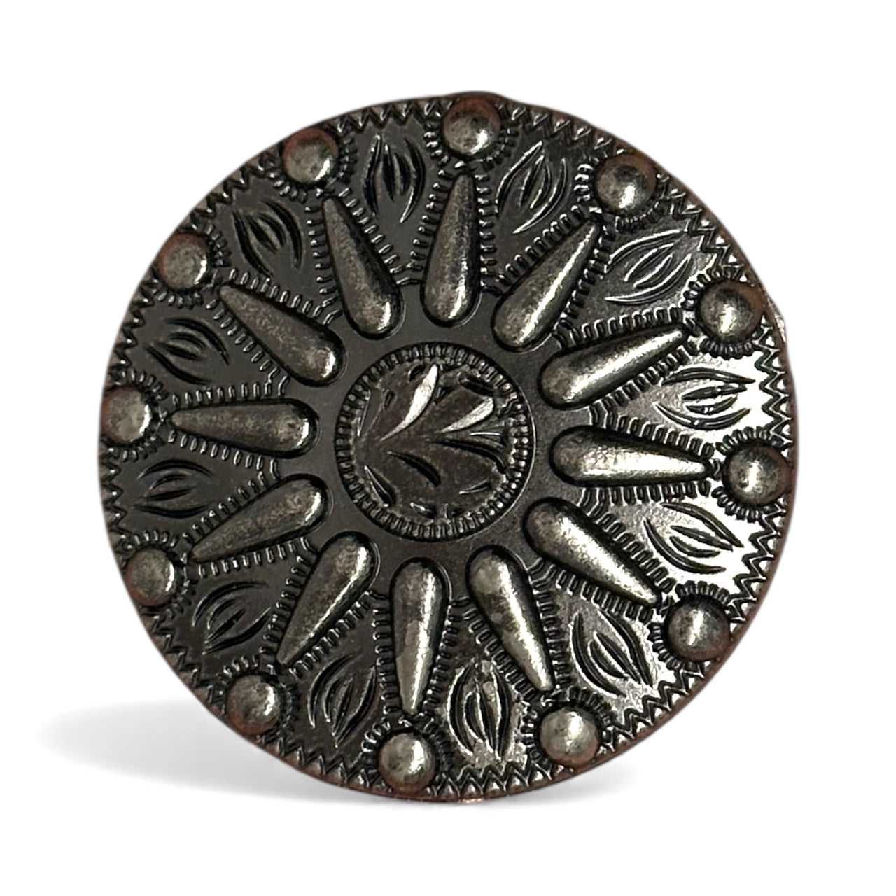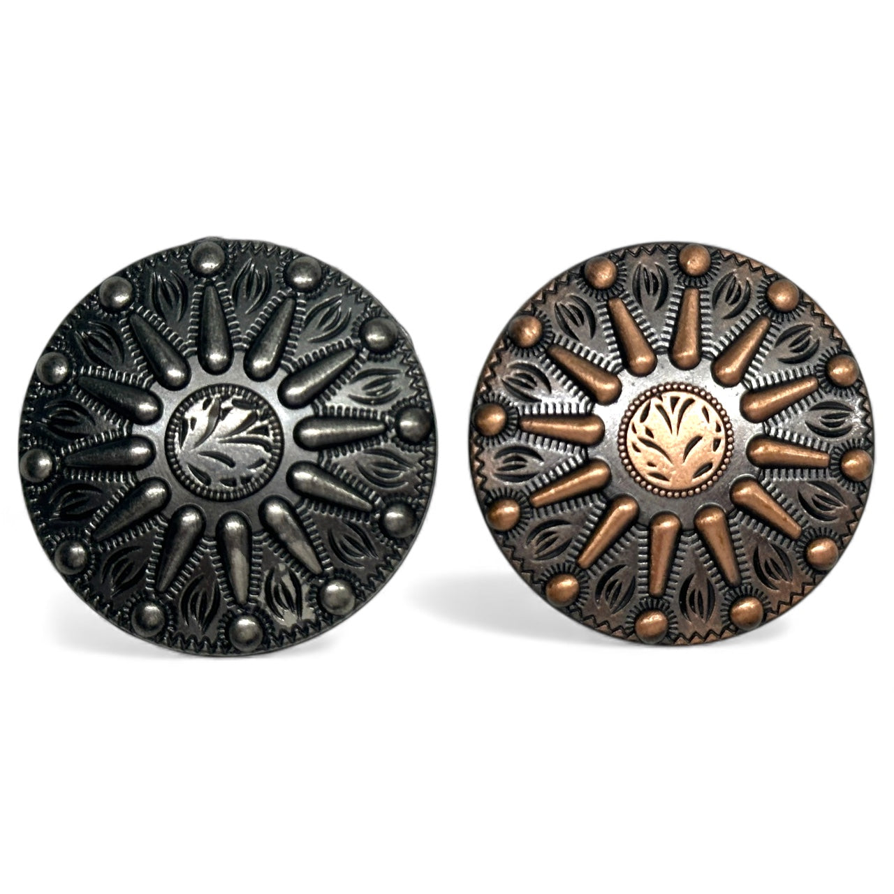NEW!! 1 1/4″ Sun concho has beautiful detailing. Available in both antique nickel and antique copper finishes. A great addition to all of your products.